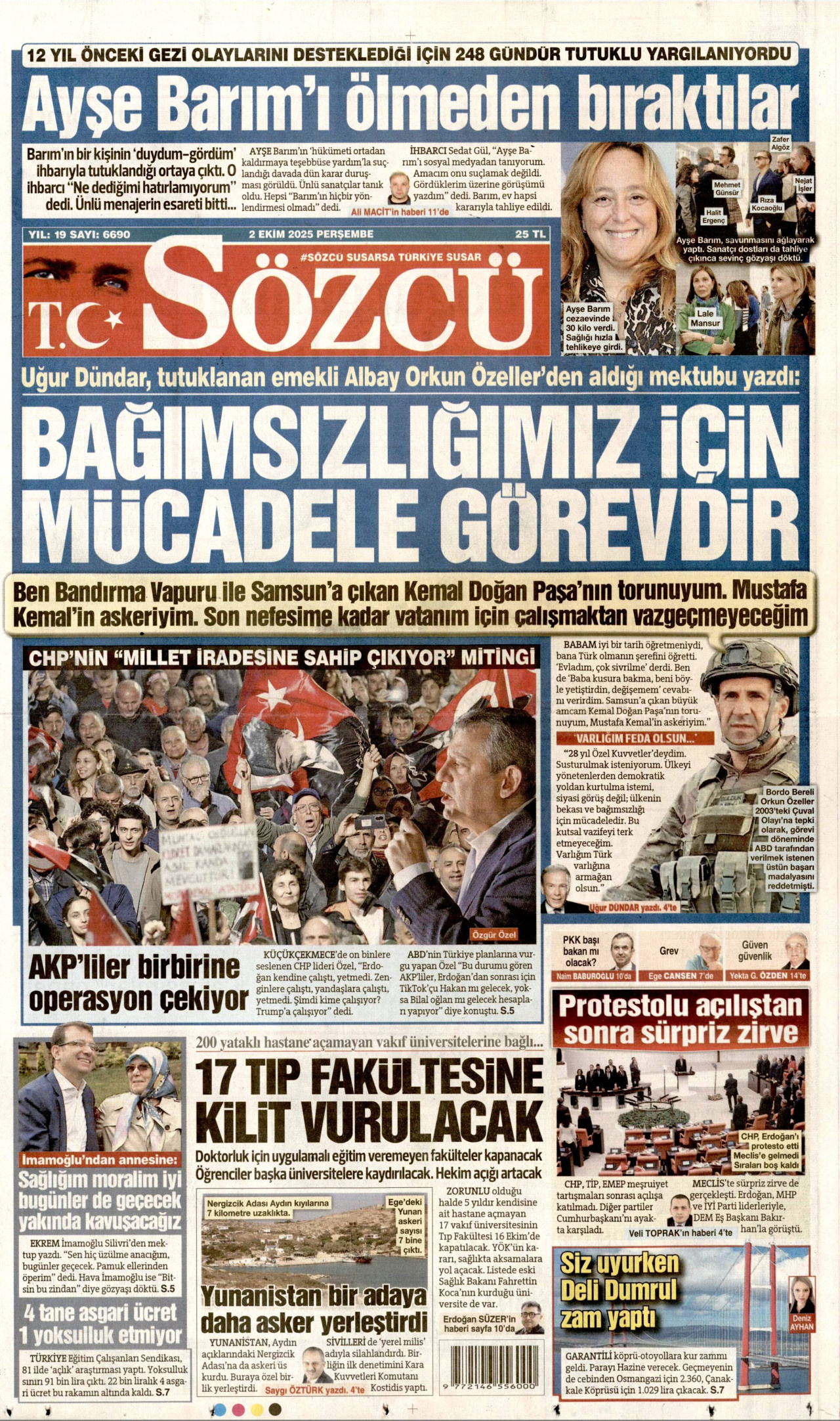 SÖZCÜ Gazetesi 02 Ekim 2025, Perşembe Günü Manşeti